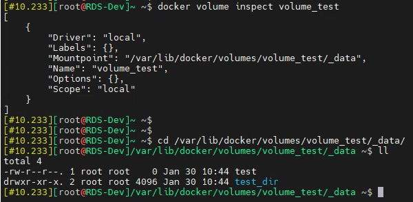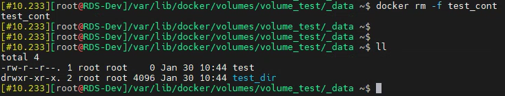 또한 docker rm 명령어로 test_cont 컨테이너를 삭제한 이후에도 volume 내부의 데이터는 그대로 남아있음을 확인할 수 있습니다.