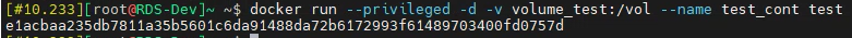 docker run --privileged -d -v volume_test:/vol --name test_cont test